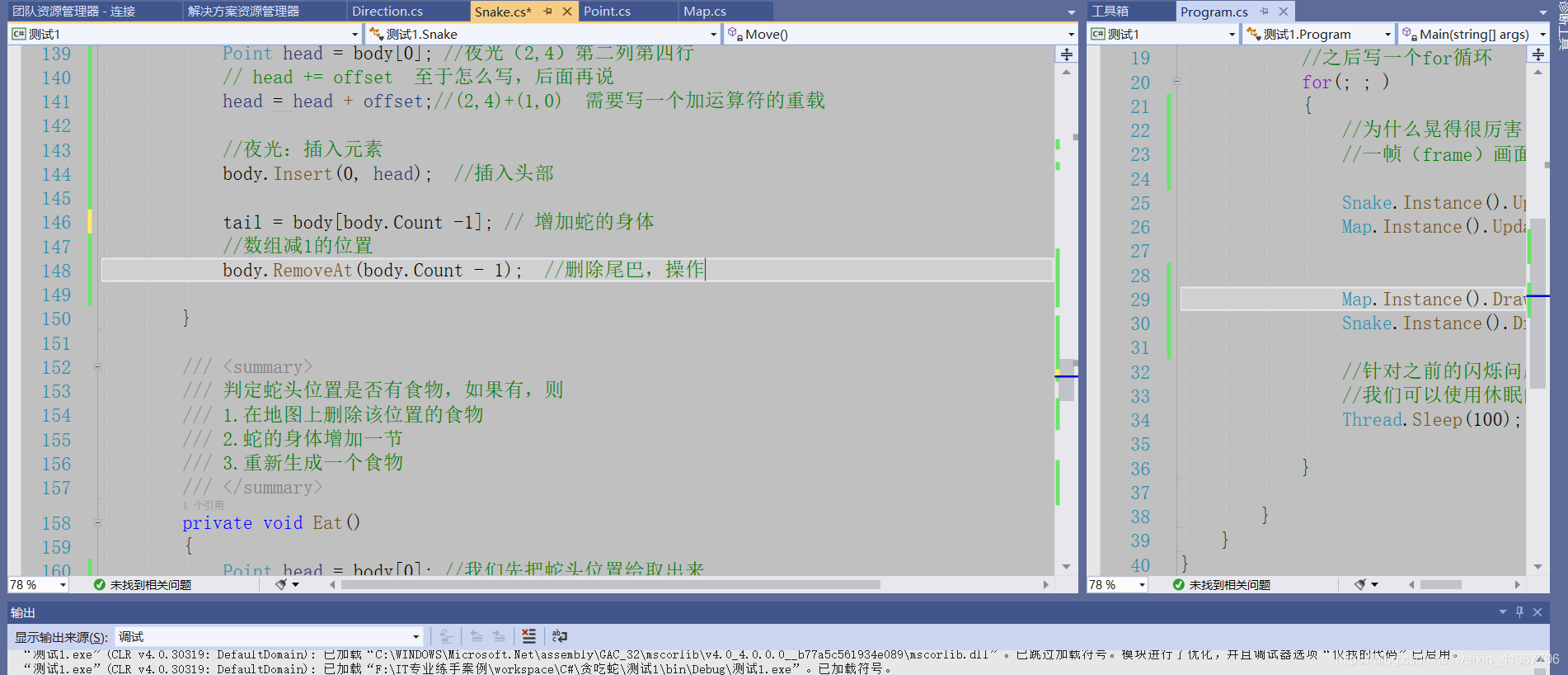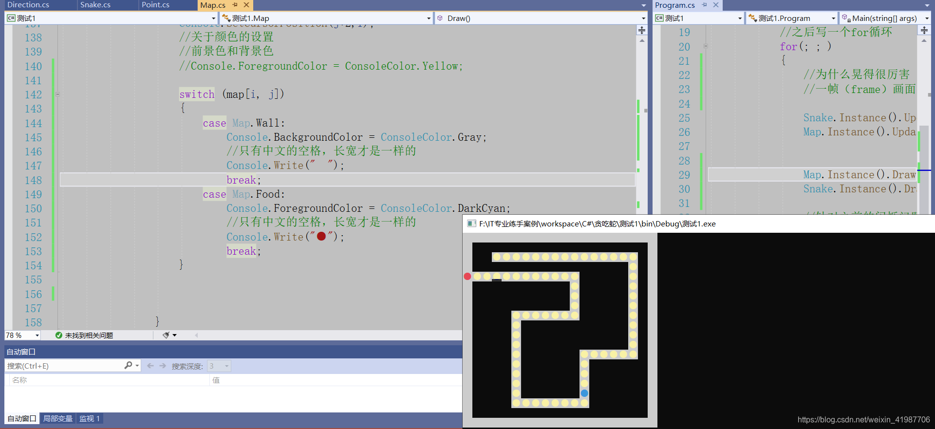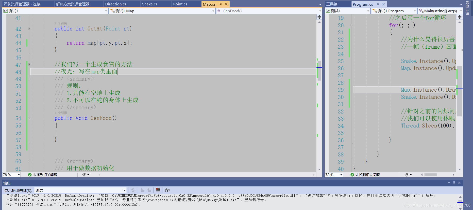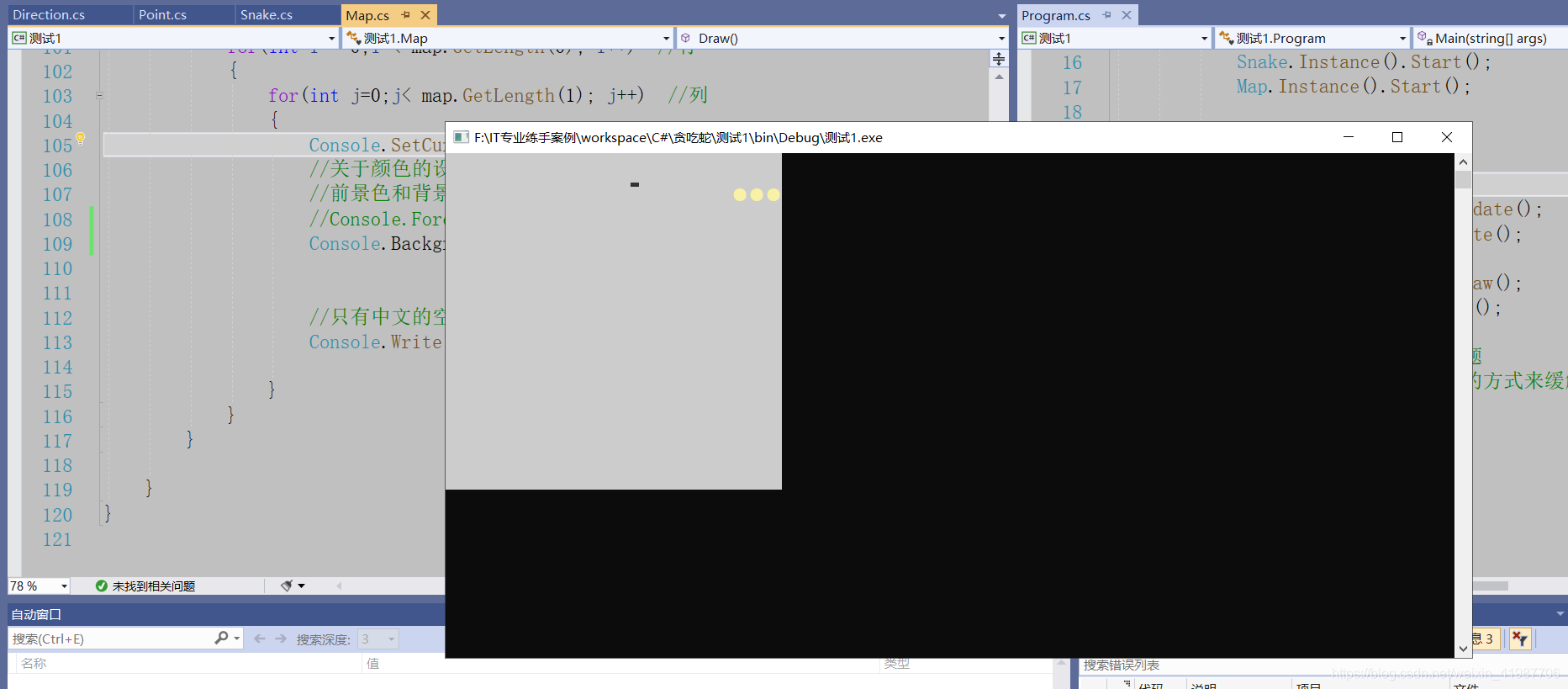 using System;using System.Collections.Generic;using System.Linq;using System.Text;using System.Threading.Tasks;namespace 测试1{ //我们希望s2 = s1 赋值的时候 //是把s1的内容(x,y)拷贝给s2(x,y) //而非让s2和s1指向同一块内存 struct Point { public int x; public int y; public Point(int x, int y) { //学编程,明白this指向当前上方的int x this.x = x; //把局部变量x 赋值给成员变量x this.y = y; } //+运算符重载 public static Point operator +(Point p1, Point p2) { return new Point(p1.x + p2.x, p1.y + p2.y); } //-运算符重载 public static bool operator==(Point p1, Point p2) { return p1.x == p2.x && p1.y == p2.y; } //取反一下,试试 public static bool operator !=(Point p1, Point p2) { return !(p1 == p2); } }} using System;using System.Collections.Generic;using System.Linq;using System.Text;using System.Threading.Tasks;namespace 测试1{ //夜光 //这个是地图类,主要用来绘制贪吃蛇地图 class Map { //下面我们建立一个单例 private static Map instance = null; public static Map Instance() { if(instance == null) { instance = new Map(); } return instance; } /// /// 地图块类型 /// /* enum TileType 想了想,做成枚举值,太麻烦,还是做成常量 { Blank, Wall, Food, }*/ public const int Blank = 0; public const int Wall = 1; public const int Food = 2; private int[,] map = null; //夜光:设计思想 //设置成私有的 /// /// 为了生成食物,定义的一个随机数 /// private Random rnd = new Random(); public int GetAt(Point pt) { return map[pt.y,pt.x]; } /// /// 写一个让食物消失的方法 /// 没有返回值,是设定 /// /// public void SetAt(Point pt,int value) { map[pt.y, pt.x] = value; } //我们写一个生成食物的方法 //夜光:写在map类里面 /// /// 规则: /// 1.只能在空地上生成 /// 2.不可以在蛇的身体上生成(这个暂时不需要~~) /// public void GenFood() { Point pt; for(; ; ) { //这就是死循环,那么什么时候退出呢 //x和y的生成 pt.x = rnd.Next(map.GetLength(1)); pt.y = rnd.Next(map.GetLength(0)); //下面就是判断 if(GetAt(pt) == Map.Blank) { map[pt.y, pt.x] = Map.Food; return; } } } /// /// 用于做数据初始化 /// public void Start() { //边缘一圈是墙 map = new int[20, 20] { {1,1,1,1,1,1,1,1,1,1,1,1,1,1,1,1,1,1,1,1,}, {1,0,0,0,0,0,0,0,0,0,0,0,0,0,0,0,0,0,0,1,}, {1,0,0,0,0,0,0,0,0,0,0,0,0,0,0,0,0,0,0,1,}, {1,0,0,0,0,0,0,0,0,0,0,0,0,0,0,0,0,0,0,1,}, {1,0,0,0,0,0,0,0,0,0,0,0,0,0,0,0,0,0,0,1,}, {1,0,0,0,0,0,0,0,0,0,0,0,0,0,0,0,0,0,0,1,}, {1,0,0,0,0,0,0,0,0,0,0,0,0,0,0,0,0,0,0,1,}, {1,0,0,0,0,0,0,0,0,0,0,0,0,0,0,0,0,0,0,1,}, {1,0,0,0,0,0,0,0,0,0,0,0,0,0,0,0,0,0,0,1,}, {1,0,0,0,0,0,0,0,0,0,0,0,0,0,0,0,0,0,0,1,}, {1,0,0,0,0,0,0,0,0,0,0,0,0,0,0,0,0,0,0,1,}, {1,0,0,0,0,0,0,0,0,0,0,0,0,0,0,0,0,0,0,1,}, {1,0,0,0,0,0,0,0,0,0,0,0,0,0,0,0,0,0,0,1,}, {1,0,0,0,0,0,0,0,0,0,0,0,0,0,0,0,0,0,0,1,}, {1,0,0,0,0,0,0,0,0,0,0,0,0,0,0,0,0,0,0,1,}, {1,0,0,0,0,0,0,0,0,0,0,0,0,0,0,0,0,0,0,1,}, {1,0,0,0,0,0,0,0,0,0,0,0,0,0,0,0,0,0,0,1,}, {1,0,0,0,0,0,0,0,0,0,0,0,0,0,0,0,0,0,0,1,}, {1,0,0,0,0,0,0,0,0,0,0,0,0,0,0,0,0,0,0,1,}, {1,1,1,1,1,1,1,1,1,1,1,1,1,1,1,1,1,1,1,1,}, }; GenFood(); } /// /// 存放逻辑处理(数据运算) /// public void Update() { /* //抛出异常 throw new NotImplementedException(); //未实现的异常*/ } /// /// 图形绘制 /// public void Draw() { for(int i = 0;i < map.GetLength(0); i++) //行 { for(int j=0;j< map.GetLength(1); j++) //列 { Console.SetCursorPosition(j*2,i); //关于颜色的设置 //前景色和背景色 //Console.ForegroundColor = ConsoleColor.Yellow; switch (map[i, j]) { case Map.Wall: Console.BackgroundColor = ConsoleColor.Gray; Console.ForegroundColor = ConsoleColor.Gray; //只有中文的空格,长宽才是一样的 Console.Write(" "); break; case Map.Food: Console.BackgroundColor = ConsoleColor.Gray; Console.ForegroundColor = ConsoleColor.DarkCyan; //只有中文的空格,长宽才是一样的 Console.Write("●"); break; case Map.Blank: Console.BackgroundColor = ConsoleColor.Gray; Console.ForegroundColor = ConsoleColor.DarkCyan; //只有中文的空格,长宽才是一样的 Console.Write(" "); break; } } } } }} using System;using System.Collections.Generic;using System.Linq;using System.Text;using System.Threading;using System.Threading.Tasks;namespace 测试1{ class Program { static void Main(string[] args) { //夜光:我们做一个贪吃蛇的游戏 //首先,根据单例,初始化两个 Snake.Instance().Start(); Map.Instance().Start(); //之后写一个for循环 for(; ; ) { //为什么晃得很厉害 //一帧(frame)画面 Snake.Instance().Update(); Map.Instance().Update(); Map.Instance().Draw(); //先画地图再画蛇 Snake.Instance().Draw(); //针对之前的闪烁问题 //我们可以使用休眠的方式来缓解 Thread.Sleep(100); } } }}