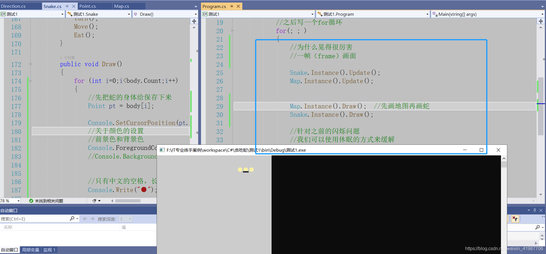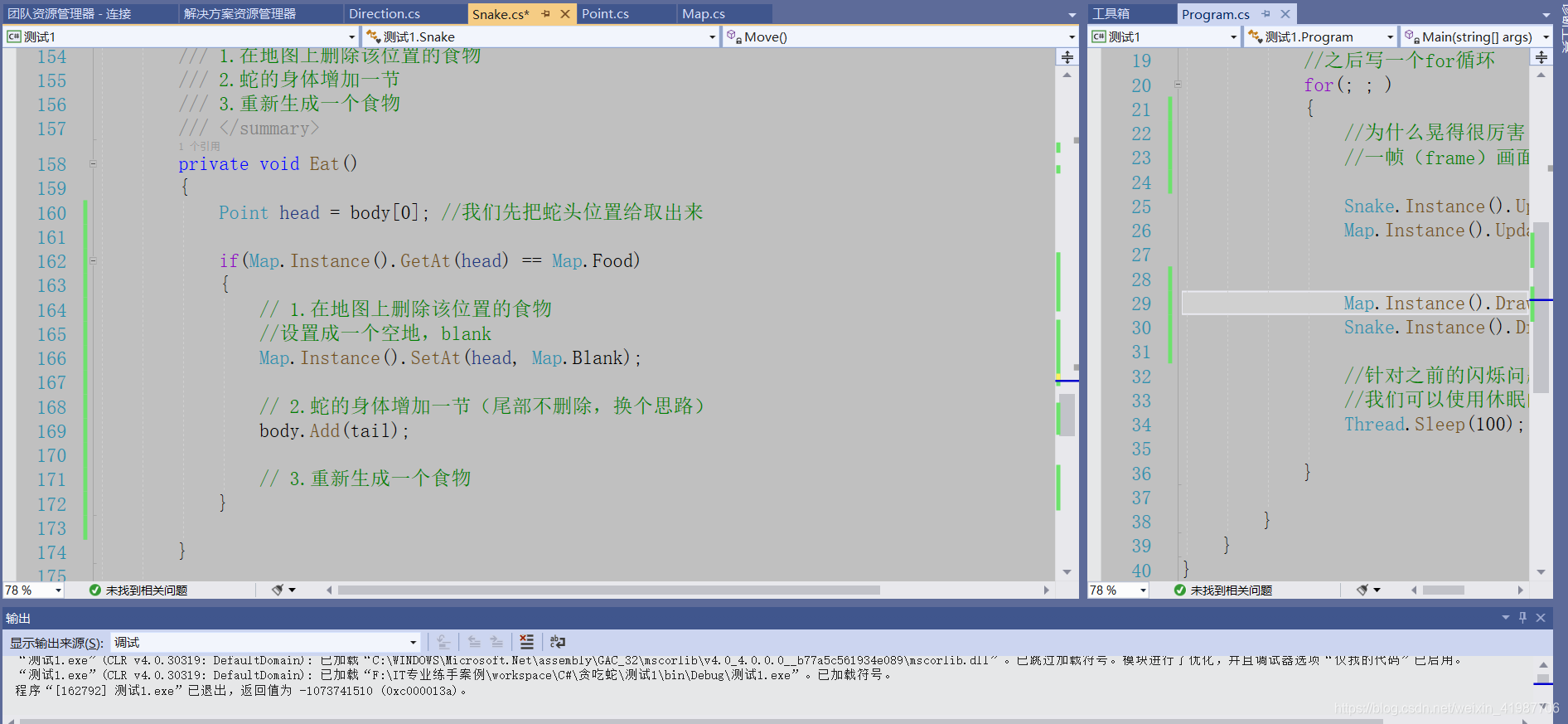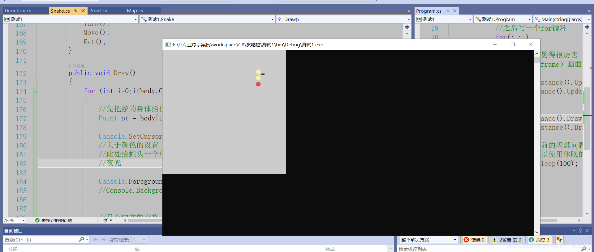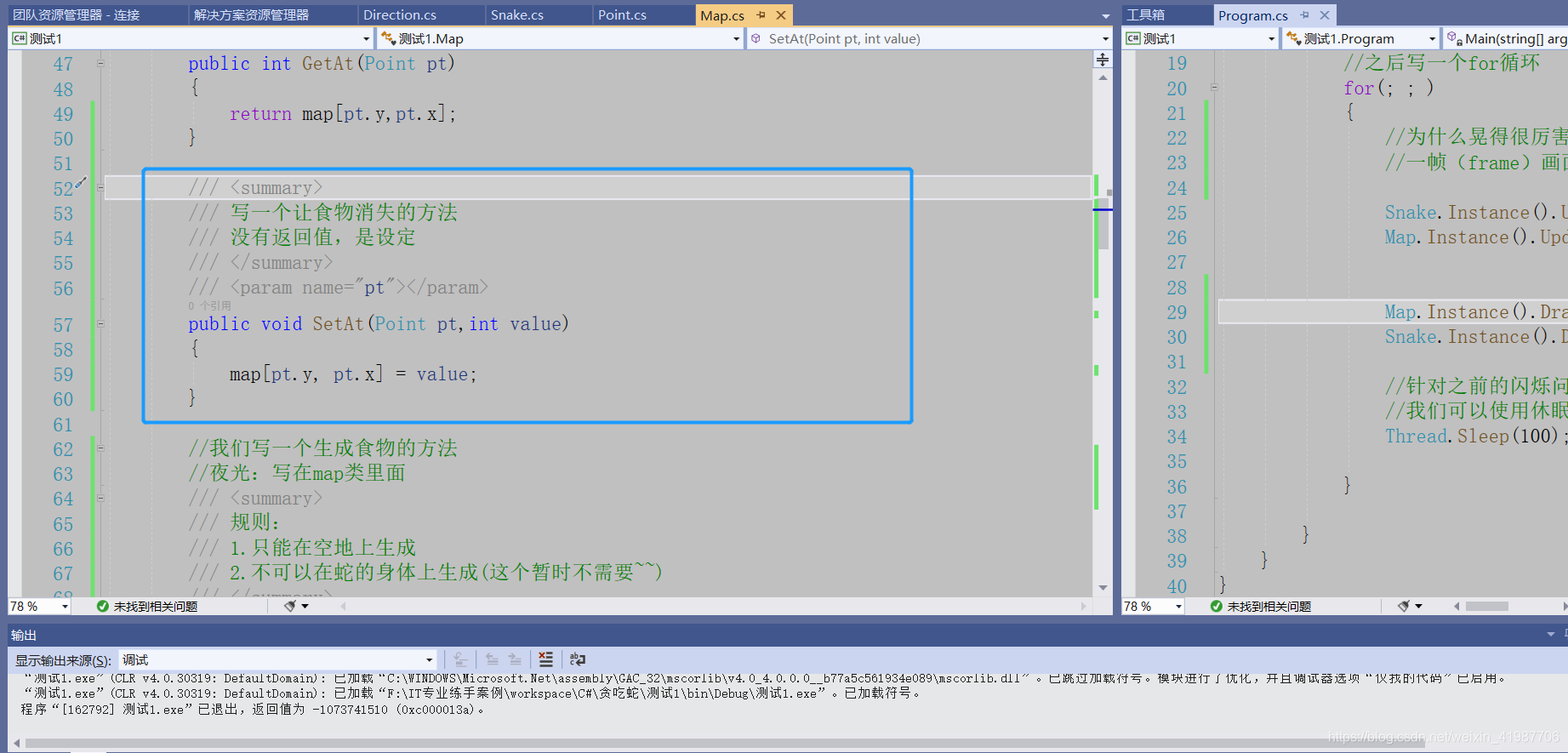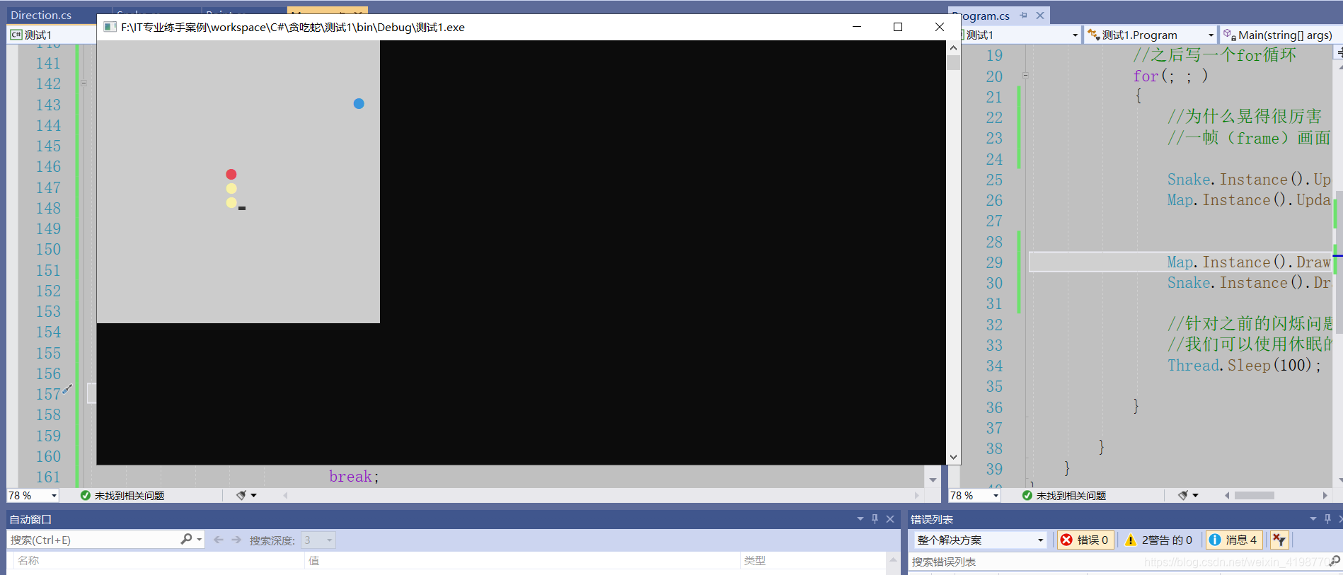 using System;using System.Collections.Generic;using System.Linq;using System.Text;using System.Threading.Tasks;namespace 测试1{ //我们希望s2 = s1 赋值的时候 //是把s1的内容(x,y)拷贝给s2(x,y) //而非让s2和s1指向同一块内存 struct Point { public int x; public int y; public Point(int x, int y) { //学编程,明白this指向当前上方的int x this.x = x; //把局部变量x 赋值给成员变量x this.y = y; } //+运算符重载 public static Point operator +(Point p1, Point p2) { return new Point(p1.x + p2.x, p1.y + p2.y); } //-运算符重载 public static bool operator==(Point p1, Point p2) { return p1.x == p2.x && p1.y == p2.y; } //取反一下,试试 public static bool operator !=(Point p1, Point p2) { return !(p1 == p2); } }} using System;using System.Collections.Generic;using System.Linq;using System.Text;using System.Threading.Tasks;namespace 测试1{ //夜光 //这个是地图类,主要用来绘制贪吃蛇地图 class Map { //下面我们建立一个单例 private static Map instance = null; public static Map Instance() { if(instance == null) { instance = new Map(); } return instance; } /// /// 地图块类型 /// /* enum TileType 想了想,做成枚举值,太麻烦,还是做成常量 { Blank, Wall, Food, }*/ public const int Blank = 0; public const int Wall = 1; public const int Food = 2; private int[,] map = null; //夜光:设计思想 //设置成私有的 /// /// 为了生成食物,定义的一个随机数 /// private Random rnd = new Random(); public int GetAt(Point pt) { return map[pt.y,pt.x]; } /// /// 写一个让食物消失的方法 /// 没有返回值,是设定 /// /// public void SetAt(Point pt,int value) { map[pt.y, pt.x] = value; } //我们写一个生成食物的方法 //夜光:写在map类里面 /// /// 规则: /// 1.只能在空地上生成 /// 2.不可以在蛇的身体上生成(这个暂时不需要~~) /// public void GenFood() { Point pt; for(; ; ) { //这就是死循环,那么什么时候退出呢 //x和y的生成 pt.x = rnd.Next(map.GetLength(1)); pt.y = rnd.Next(map.GetLength(0)); //下面就是判断 if(GetAt(pt) == Map.Blank) { map[pt.y, pt.x] = Map.Food; return; } } } /// /// 用于做数据初始化 /// public void Start() { //边缘一圈是墙 map = new int[20, 20] { {1,1,1,1,1,1,1,1,1,1,1,1,1,1,1,1,1,1,1,1,}, {1,0,0,0,0,0,0,0,0,0,0,0,0,0,0,0,0,0,0,1,}, {1,0,0,0,0,0,0,0,0,0,0,0,0,0,0,0,0,0,0,1,}, {1,0,0,0,0,0,0,0,0,0,0,0,0,0,0,0,0,0,0,1,}, {1,0,0,0,0,0,0,0,0,0,0,0,0,0,0,0,0,0,0,1,}, {1,0,0,0,0,0,0,0,0,0,0,0,0,0,0,0,0,0,0,1,}, {1,0,0,0,0,0,0,0,0,0,0,0,0,0,0,0,0,0,0,1,}, {1,0,0,0,0,0,0,0,0,0,0,0,0,0,0,0,0,0,0,1,}, {1,0,0,0,0,0,0,0,0,0,0,0,0,0,0,0,0,0,0,1,}, {1,0,0,0,0,0,0,0,0,0,0,0,0,0,0,0,0,0,0,1,}, {1,0,0,0,0,0,0,0,0,0,0,0,0,0,0,0,0,0,0,1,}, {1,0,0,0,0,0,0,0,0,0,0,0,0,0,0,0,0,0,0,1,}, {1,0,0,0,0,0,0,0,0,0,0,0,0,0,0,0,0,0,0,1,}, {1,0,0,0,0,0,0,0,0,0,0,0,0,0,0,0,0,0,0,1,}, {1,0,0,0,0,0,0,0,0,0,0,0,0,0,0,0,0,0,0,1,}, {1,0,0,0,0,0,0,0,0,0,0,0,0,0,0,0,0,0,0,1,}, {1,0,0,0,0,0,0,0,0,0,0,0,0,0,0,0,0,0,0,1,}, {1,0,0,0,0,0,0,0,0,0,0,0,0,0,0,0,0,0,0,1,}, {1,0,0,0,0,0,0,0,0,0,0,0,0,0,0,0,0,0,0,1,}, {1,1,1,1,1,1,1,1,1,1,1,1,1,1,1,1,1,1,1,1,}, }; GenFood(); } /// /// 存放逻辑处理(数据运算) /// public void Update() { /* //抛出异常 throw new NotImplementedException(); //未实现的异常*/ } /// /// 图形绘制 /// public void Draw() { for(int i = 0;i < map.GetLength(0); i++) //行 { for(int j=0;j< map.GetLength(1); j++) //列 { Console.SetCursorPosition(j*2,i); //关于颜色的设置 //前景色和背景色 //Console.ForegroundColor = ConsoleColor.Yellow; switch (map[i, j]) { case Map.Wall: Console.BackgroundColor = ConsoleColor.Gray; Console.ForegroundColor = ConsoleColor.Gray; //只有中文的空格,长宽才是一样的 Console.Write(" "); break; case Map.Food: Console.BackgroundColor = ConsoleColor.Gray; Console.ForegroundColor = ConsoleColor.DarkCyan; //只有中文的空格,长宽才是一样的 Console.Write("●"); break; case Map.Blank: Console.BackgroundColor = ConsoleColor.Gray; Console.ForegroundColor = ConsoleColor.DarkCyan; //只有中文的空格,长宽才是一样的 Console.Write(" "); break; } } } } }} using System;using System.Collections.Generic;using System.Linq;using System.Text;using System.Threading;using System.Threading.Tasks;namespace 测试1{ class Program { static void Main(string[] args) { //夜光:我们做一个贪吃蛇的游戏 //首先,根据单例,初始化两个 Snake.Instance().Start(); Map.Instance().Start(); //之后写一个for循环 for(; ; ) { //为什么晃得很厉害 //一帧(frame)画面 Snake.Instance().Update(); Map.Instance().Update(); Map.Instance().Draw(); //先画地图再画蛇 Snake.Instance().Draw(); //针对之前的闪烁问题 //我们可以使用休眠的方式来缓解 Thread.Sleep(100); } } }}