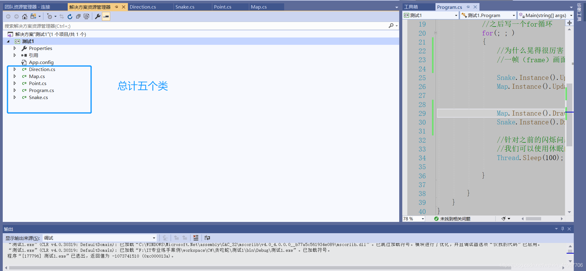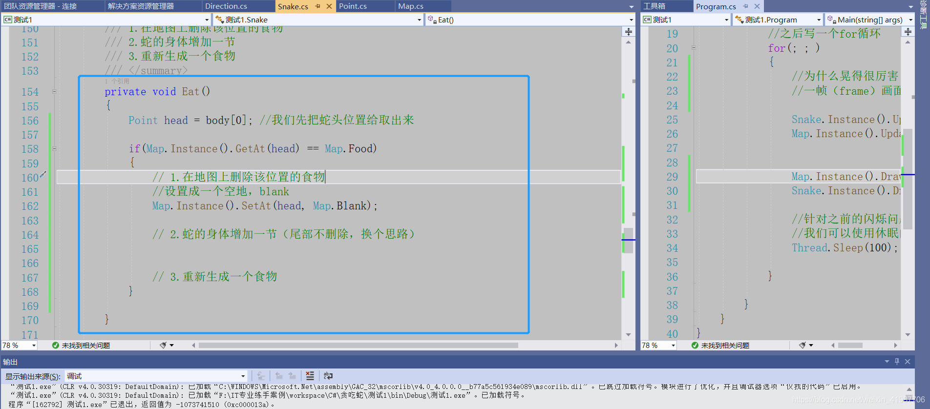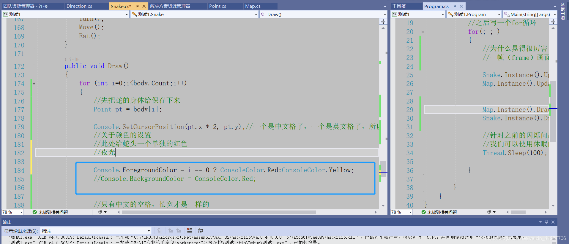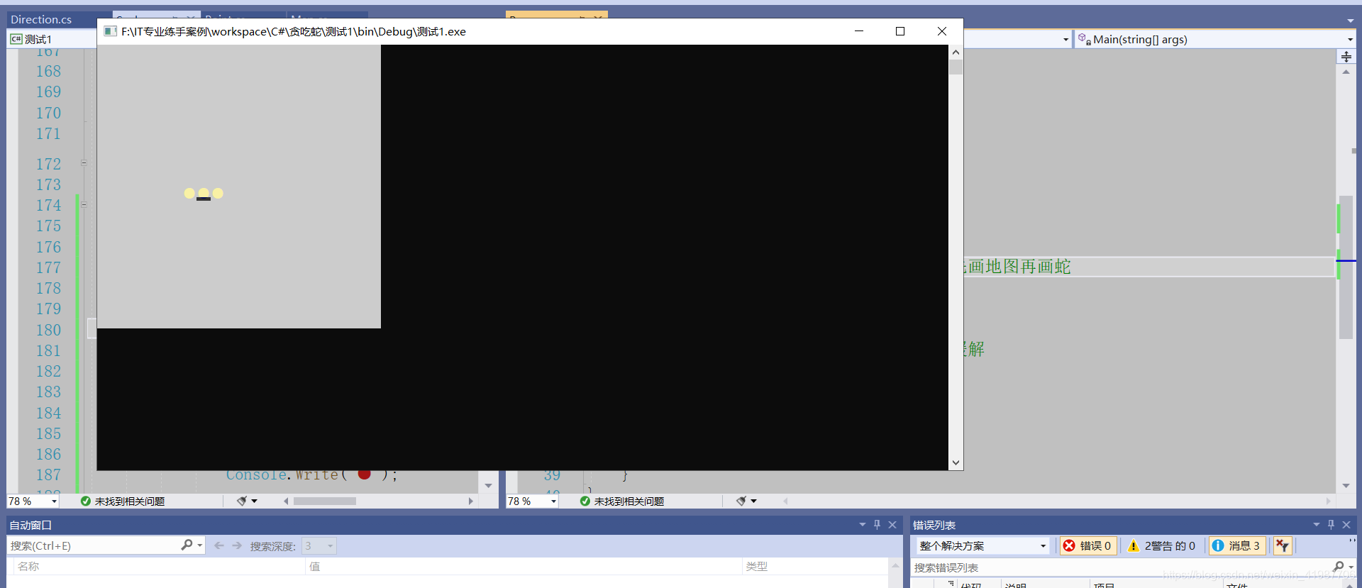 using System;using System.Collections.Generic;using System.Linq;using System.Text;using System.Threading.Tasks;namespace 测试1{ //我们希望s2 = s1 赋值的时候 //是把s1的内容(x,y)拷贝给s2(x,y) //而非让s2和s1指向同一块内存 struct Point { public int x; public int y; public Point(int x, int y) { //学编程,明白this指向当前上方的int x this.x = x; //把局部变量x 赋值给成员变量x this.y = y; } //+运算符重载 public static Point operator +(Point p1, Point p2) { return new Point(p1.x + p2.x, p1.y + p2.y); } //-运算符重载 public static bool operator==(Point p1, Point p2) { return p1.x == p2.x && p1.y == p2.y; } //取反一下,试试 public static bool operator !=(Point p1, Point p2) { return !(p1 == p2); } }} using System;using System.Collections.Generic;using System.Linq;using System.Text;using System.Threading.Tasks;namespace 测试1{ //夜光 //这个是地图类,主要用来绘制贪吃蛇地图 class Map { //下面我们建立一个单例 private static Map instance = null; public static Map Instance() { if(instance == null) { instance = new Map(); } return instance; } /// /// 地图块类型 /// /* enum TileType 想了想,做成枚举值,太麻烦,还是做成常量 { Blank, Wall, Food, }*/ public const int Blank = 0; public const int Wall = 1; public const int Food = 2; private int[,] map = null; //夜光:设计思想 //设置成私有的 /// /// 为了生成食物,定义的一个随机数 /// private Random rnd = new Random(); public int GetAt(Point pt) { return map[pt.y,pt.x]; } /// /// 写一个让食物消失的方法 /// 没有返回值,是设定 /// /// public void SetAt(Point pt,int value) { map[pt.y, pt.x] = value; } //我们写一个生成食物的方法 //夜光:写在map类里面 /// /// 规则: /// 1.只能在空地上生成 /// 2.不可以在蛇的身体上生成(这个暂时不需要~~) /// public void GenFood() { Point pt; for(; ; ) { //这就是死循环,那么什么时候退出呢 //x和y的生成 pt.x = rnd.Next(map.GetLength(1)); pt.y = rnd.Next(map.GetLength(0)); //下面就是判断 if(GetAt(pt) == Map.Blank) { map[pt.y, pt.x] = Map.Food; return; } } } /// /// 用于做数据初始化 /// public void Start() { //边缘一圈是墙 map = new int[20, 20] { {1,1,1,1,1,1,1,1,1,1,1,1,1,1,1,1,1,1,1,1,}, {1,0,0,0,0,0,0,0,0,0,0,0,0,0,0,0,0,0,0,1,}, {1,0,0,0,0,0,0,0,0,0,0,0,0,0,0,0,0,0,0,1,}, {1,0,0,0,0,0,0,0,0,0,0,0,0,0,0,0,0,0,0,1,}, {1,0,0,0,0,0,0,0,0,0,0,0,0,0,0,0,0,0,0,1,}, {1,0,0,0,0,0,0,0,0,0,0,0,0,0,0,0,0,0,0,1,}, {1,0,0,0,0,0,0,0,0,0,0,0,0,0,0,0,0,0,0,1,}, {1,0,0,0,0,0,0,0,0,0,0,0,0,0,0,0,0,0,0,1,}, {1,0,0,0,0,0,0,0,0,0,0,0,0,0,0,0,0,0,0,1,}, {1,0,0,0,0,0,0,0,0,0,0,0,0,0,0,0,0,0,0,1,}, {1,0,0,0,0,0,0,0,0,0,0,0,0,0,0,0,0,0,0,1,}, {1,0,0,0,0,0,0,0,0,0,0,0,0,0,0,0,0,0,0,1,}, {1,0,0,0,0,0,0,0,0,0,0,0,0,0,0,0,0,0,0,1,}, {1,0,0,0,0,0,0,0,0,0,0,0,0,0,0,0,0,0,0,1,}, {1,0,0,0,0,0,0,0,0,0,0,0,0,0,0,0,0,0,0,1,}, {1,0,0,0,0,0,0,0,0,0,0,0,0,0,0,0,0,0,0,1,}, {1,0,0,0,0,0,0,0,0,0,0,0,0,0,0,0,0,0,0,1,}, {1,0,0,0,0,0,0,0,0,0,0,0,0,0,0,0,0,0,0,1,}, {1,0,0,0,0,0,0,0,0,0,0,0,0,0,0,0,0,0,0,1,}, {1,1,1,1,1,1,1,1,1,1,1,1,1,1,1,1,1,1,1,1,}, }; GenFood(); } /// /// 存放逻辑处理(数据运算) /// public void Update() { /* //抛出异常 throw new NotImplementedException(); //未实现的异常*/ } /// /// 图形绘制 /// public void Draw() { for(int i = 0;i < map.GetLength(0); i++) //行 { for(int j=0;j< map.GetLength(1); j++) //列 { Console.SetCursorPosition(j*2,i); //关于颜色的设置 //前景色和背景色 //Console.ForegroundColor = ConsoleColor.Yellow; switch (map[i, j]) { case Map.Wall: Console.BackgroundColor = ConsoleColor.Gray; Console.ForegroundColor = ConsoleColor.Gray; //只有中文的空格,长宽才是一样的 Console.Write(" "); break; case Map.Food: Console.BackgroundColor = ConsoleColor.Gray; Console.ForegroundColor = ConsoleColor.DarkCyan; //只有中文的空格,长宽才是一样的 Console.Write("●"); break; case Map.Blank: Console.BackgroundColor = ConsoleColor.Gray; Console.ForegroundColor = ConsoleColor.DarkCyan; //只有中文的空格,长宽才是一样的 Console.Write(" "); break; } } } } }} using System;using System.Collections.Generic;using System.Linq;using System.Text;using System.Threading;using System.Threading.Tasks;namespace 测试1{ class Program { static void Main(string[] args) { //夜光:我们做一个贪吃蛇的游戏 //首先,根据单例,初始化两个 Snake.Instance().Start(); Map.Instance().Start(); //之后写一个for循环 for(; ; ) { //为什么晃得很厉害 //一帧(frame)画面 Snake.Instance().Update(); Map.Instance().Update(); Map.Instance().Draw(); //先画地图再画蛇 Snake.Instance().Draw(); //针对之前的闪烁问题 //我们可以使用休眠的方式来缓解 Thread.Sleep(100); } } }}